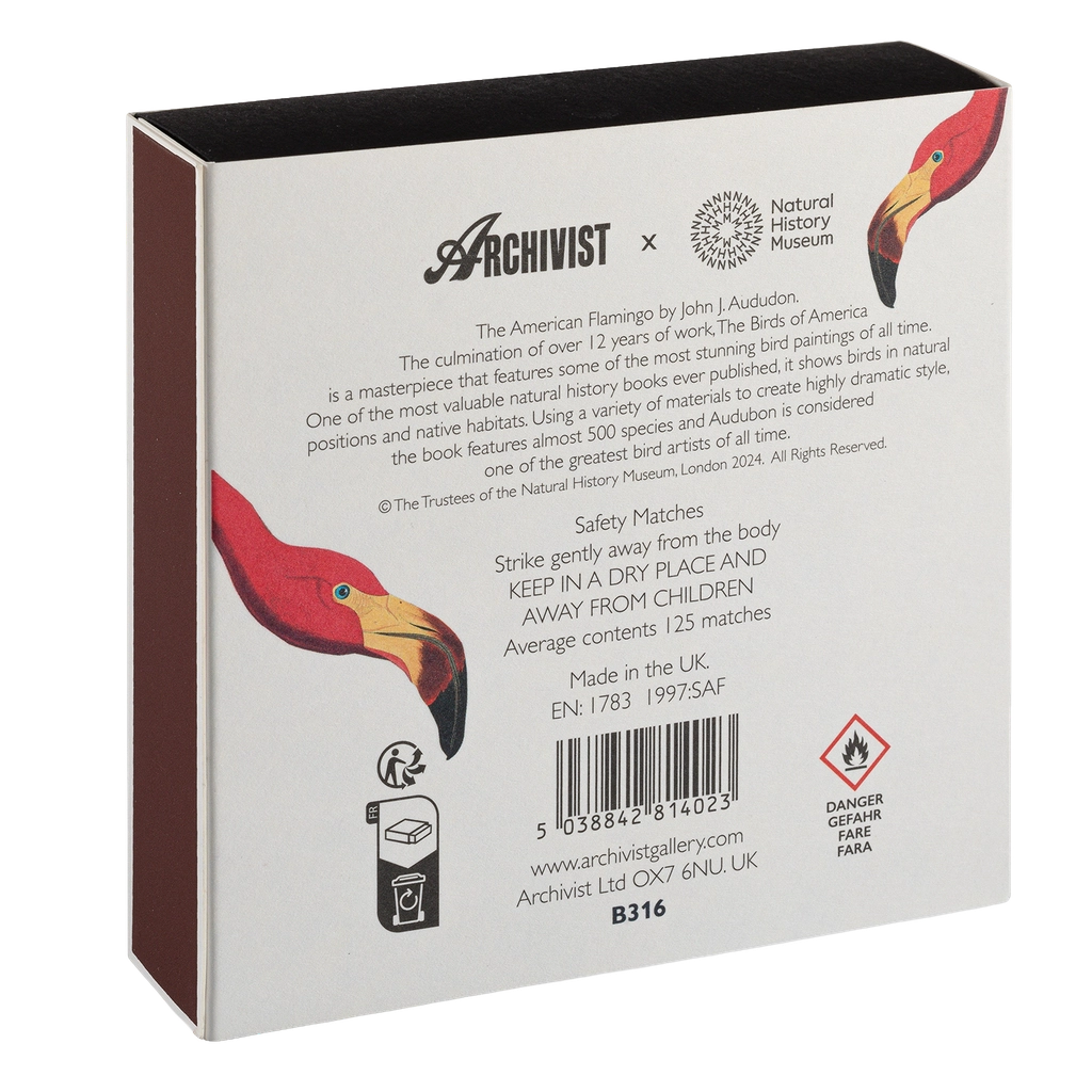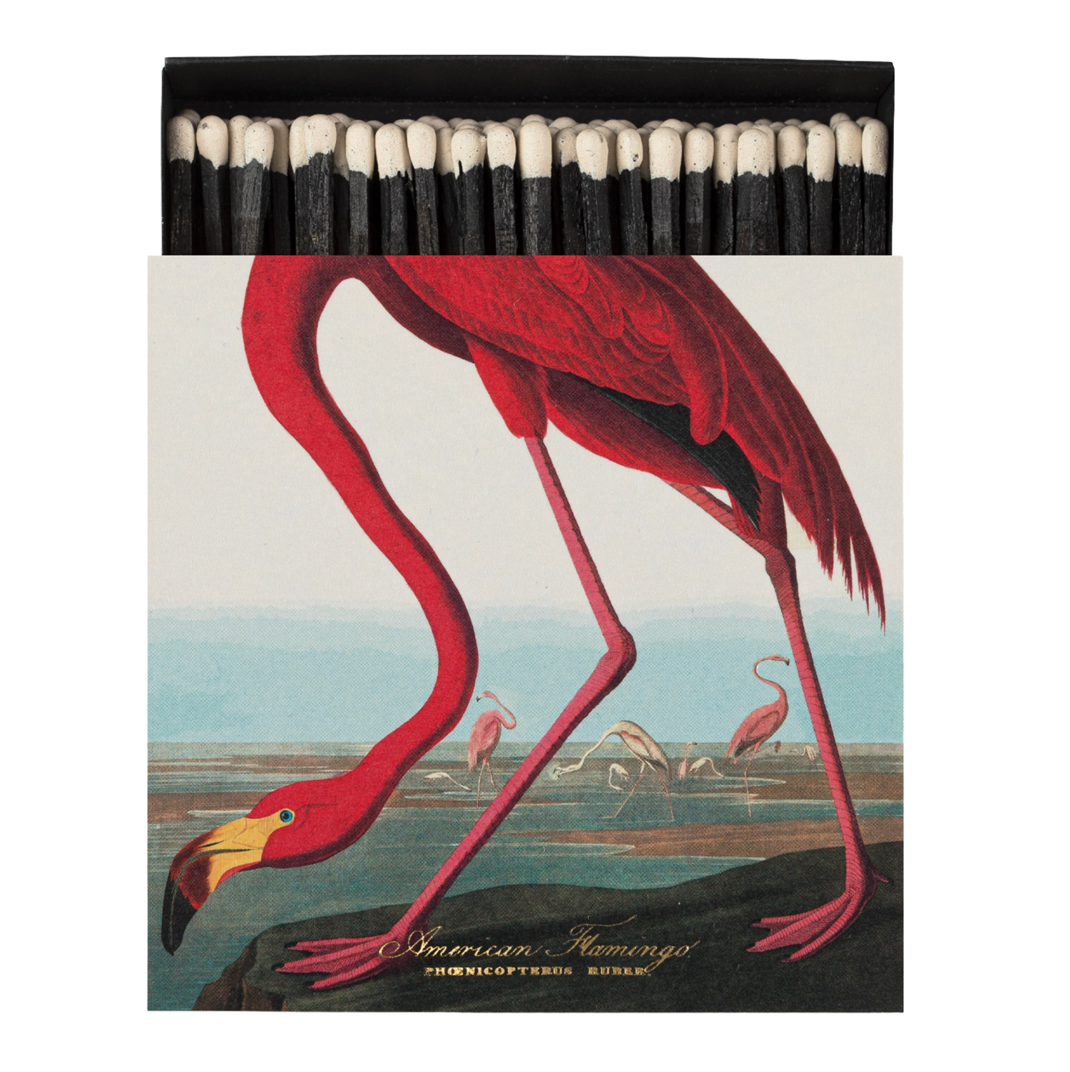 Boîte d’allumettes carrée illustrée d’un flamant rose, inspirée des planches naturalistes anciennes.