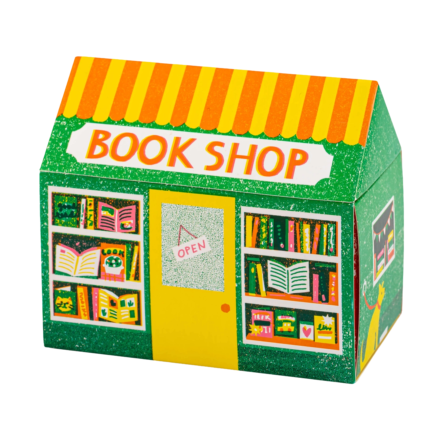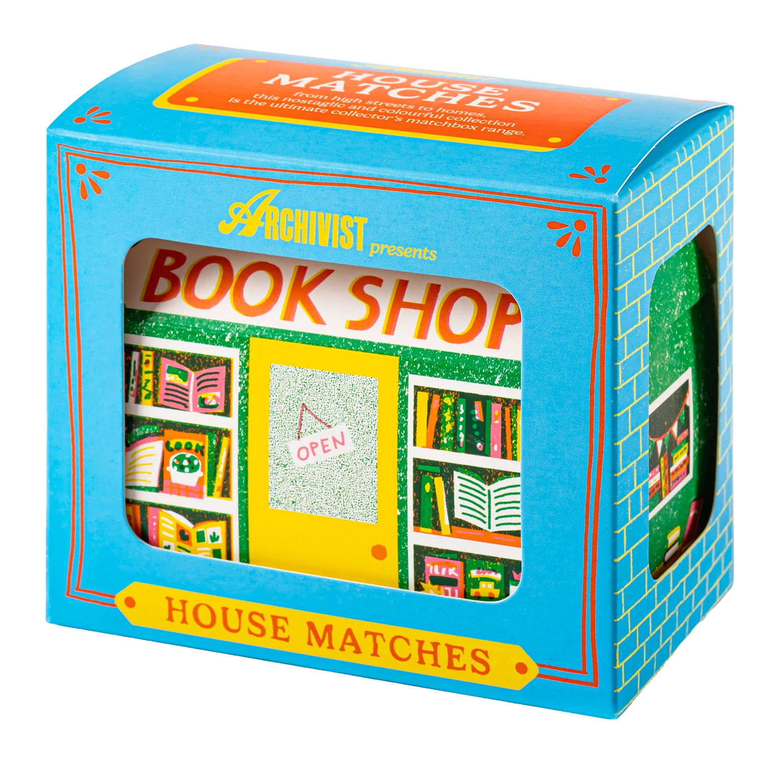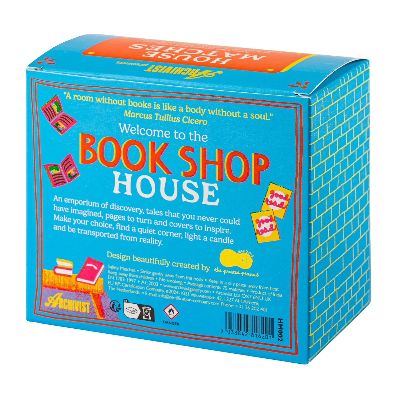 Boîte d’allumettes illustrée, en forme de petite librairie au charme rétro, parfaite pour allumer bougies et cheminée avec style.