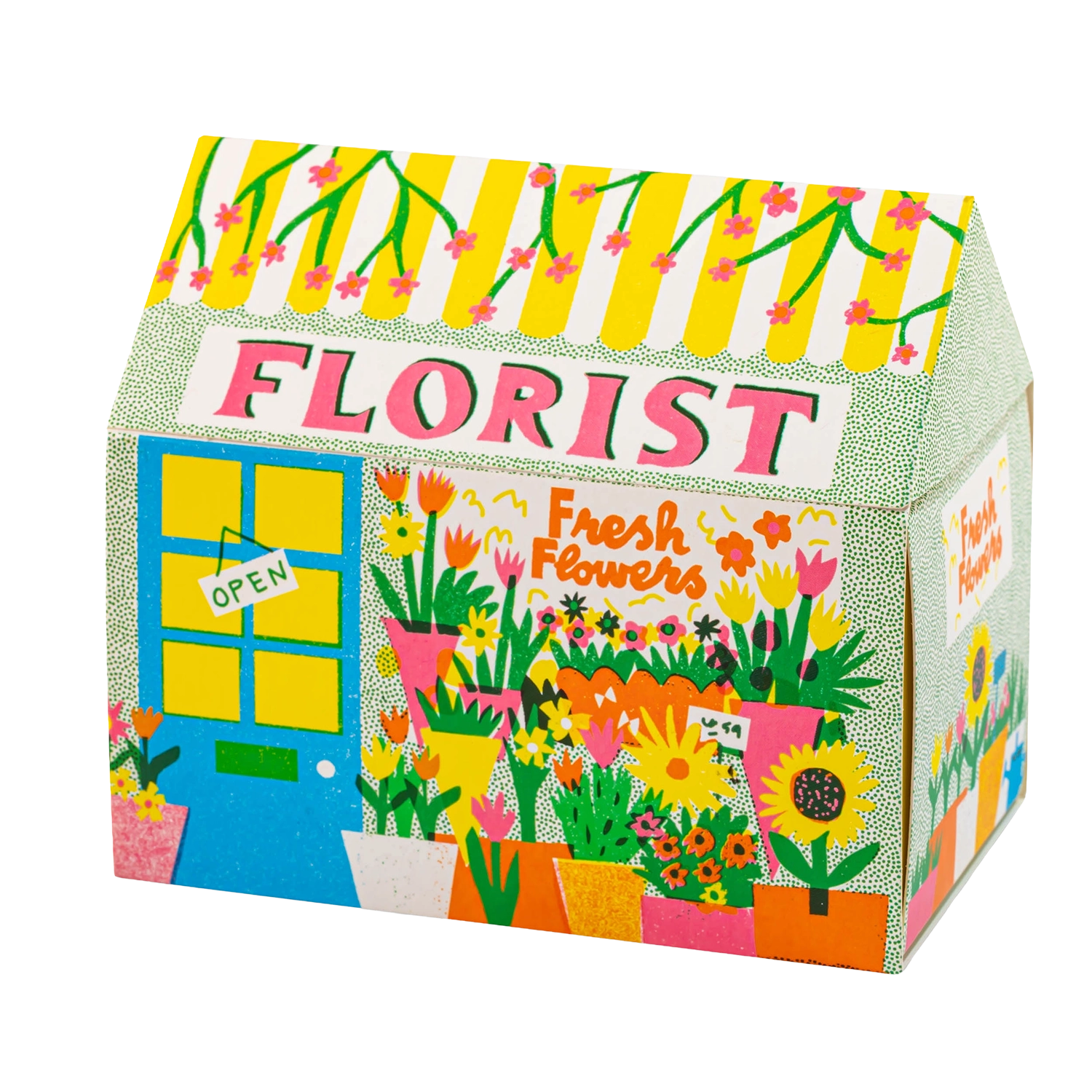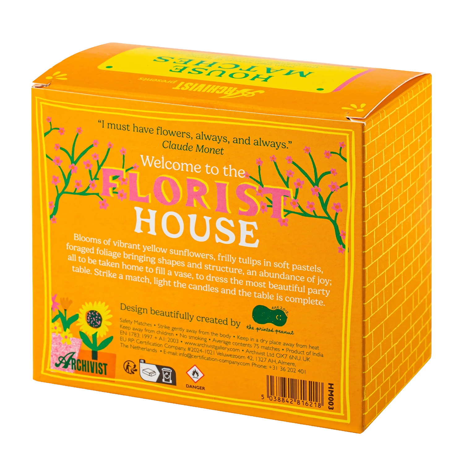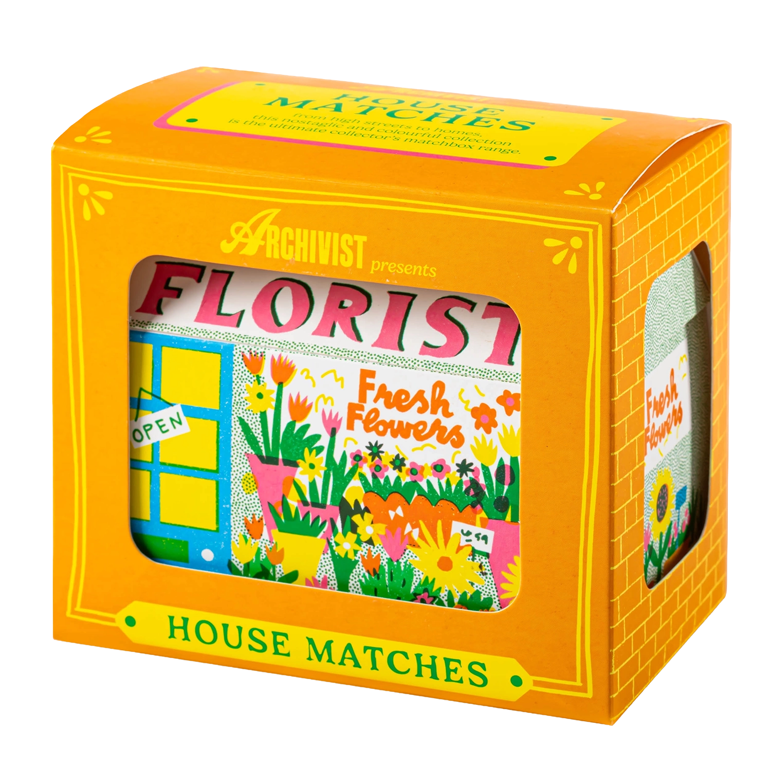 Boîte d’allumettes illustrée, en forme de petite boutique de fleuriste aux couleurs printanières, idéale pour allumer bougies et cheminée avec bonne humeur.