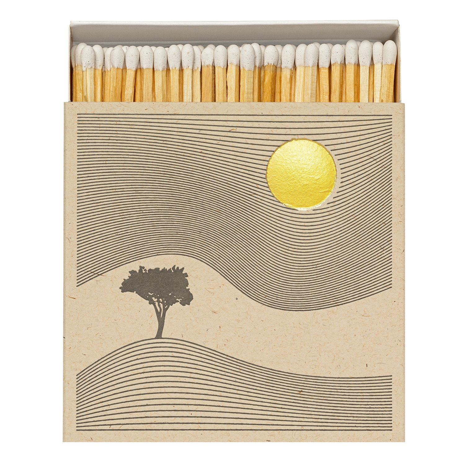 Boîte d’allumettes carrée illustrée d’un paysage minimaliste, entre lignes de collines et soleil doré.