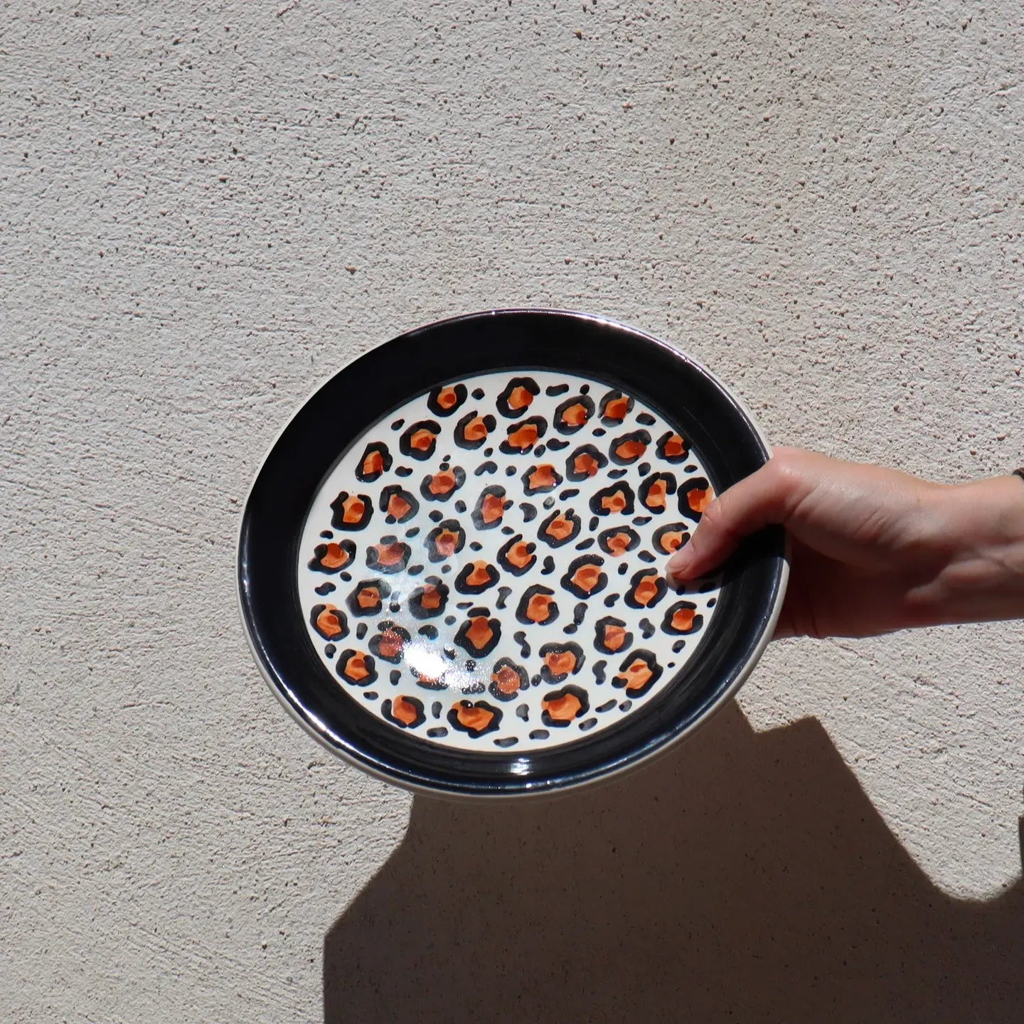 Assiette en céramique artisanale, à l’extérieur noir profond et à l’intérieur orné d’un motif léopard peint à la main.