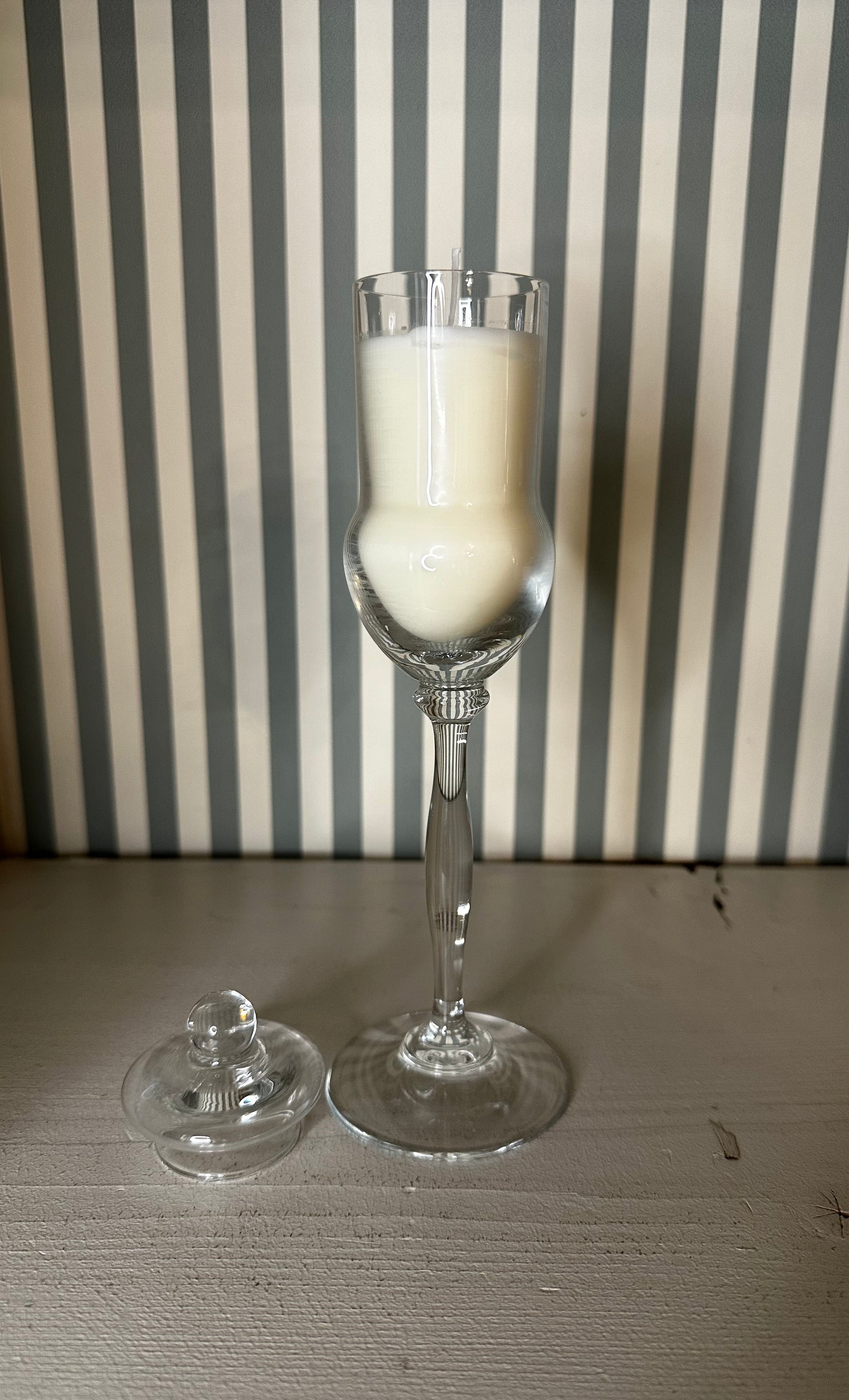 Une bougie élégante coulée dans un verre à pied, délicatement galbé, avec son petit couvercle en verre assorti. Une pièce raffinée, à la fois déco et précieuse, parfaite pour apporter une lumière douce sur une table, une console ou une salle de bain.
