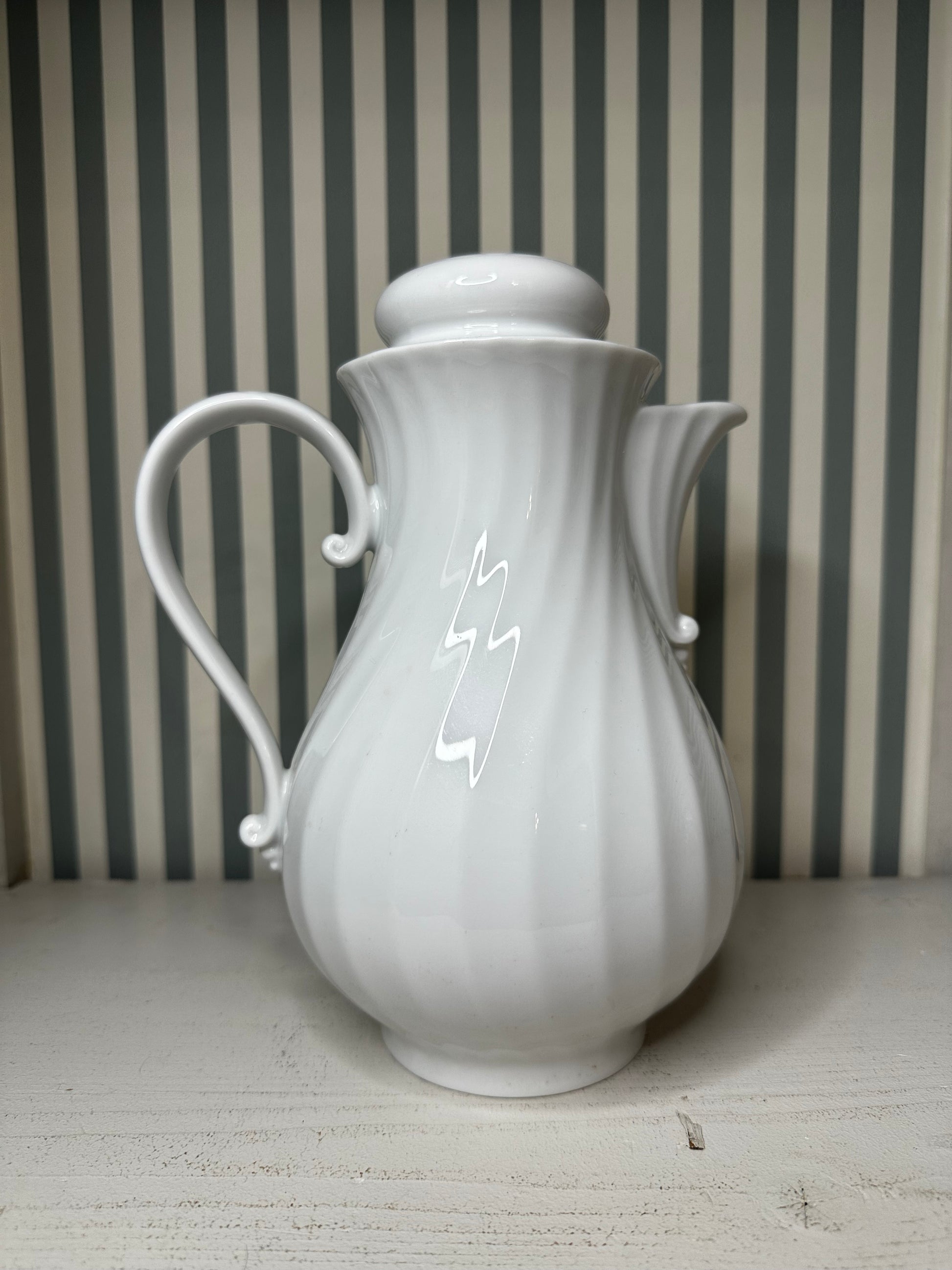 Élégante cafetière en porcelaine blanche signée Royal Schwabap, reconnaissable à ses lignes douces et à sa silhouette intemporelle. Un bel objet du quotidien, à la fois décoratif et fonctionnel, qui traverse les époques sans prendre une ride. Parfaite sur une table de petit-déjeuner ou détournée en carafe pour une table chic et simple.