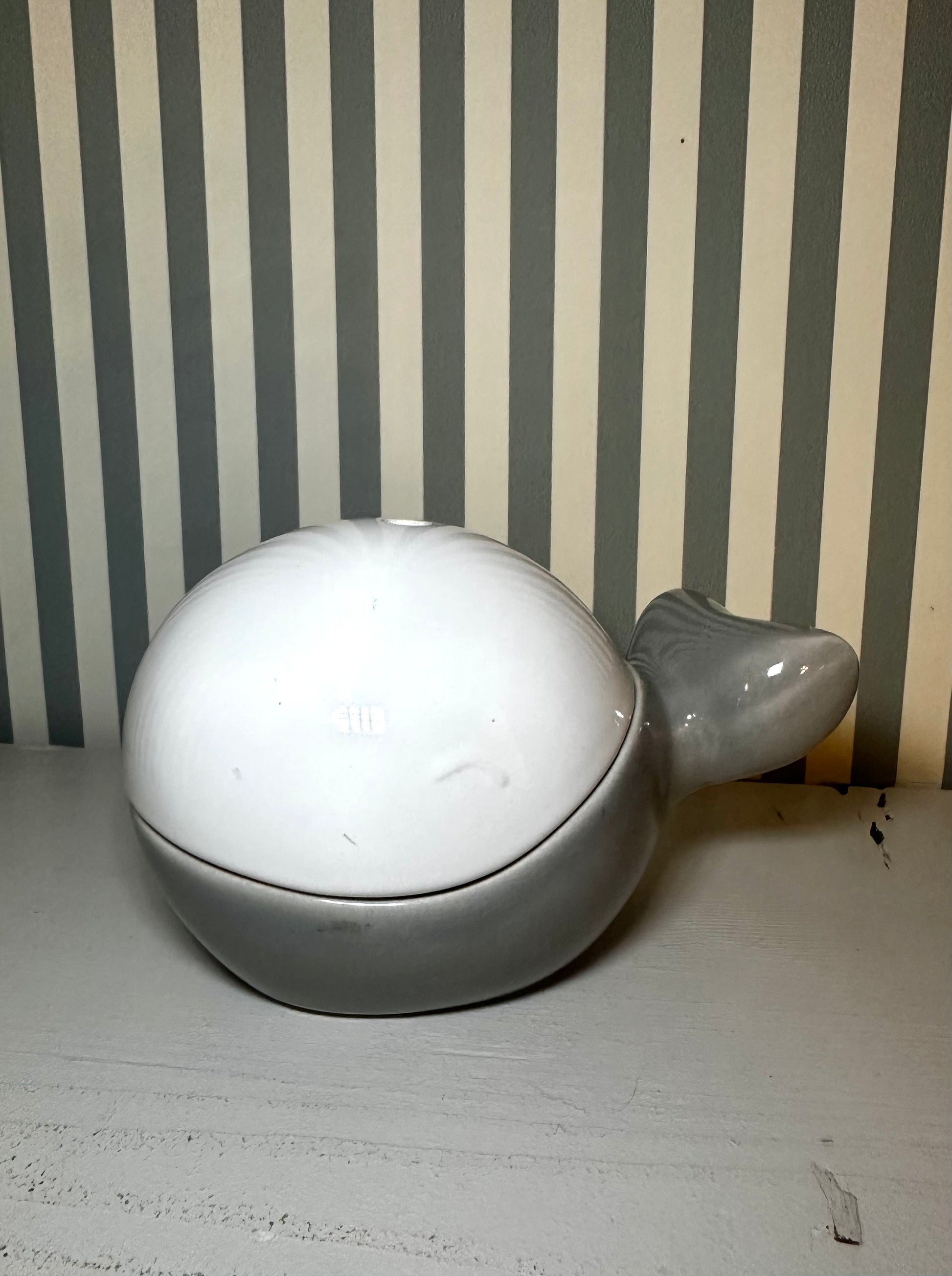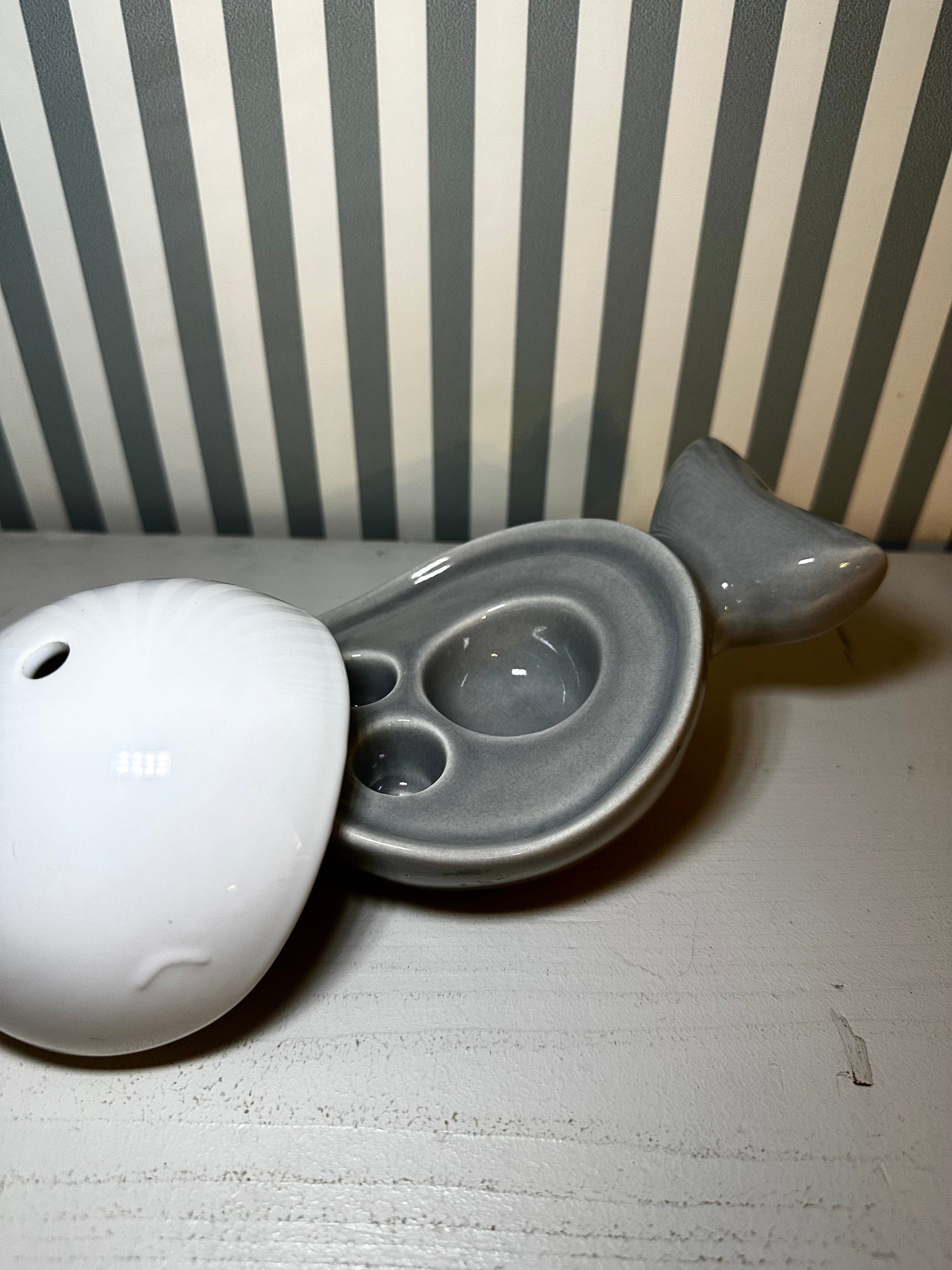 Adorable coquetier en forme de petite baleine, en céramique grise et blanche. À l’intérieur : trois cavités pour poser un œuf coque, un peu de sel, et même une mini cuillère. Le couvercle se referme comme une petite coquille, irrésistible sur la table du petit-déjeuner.