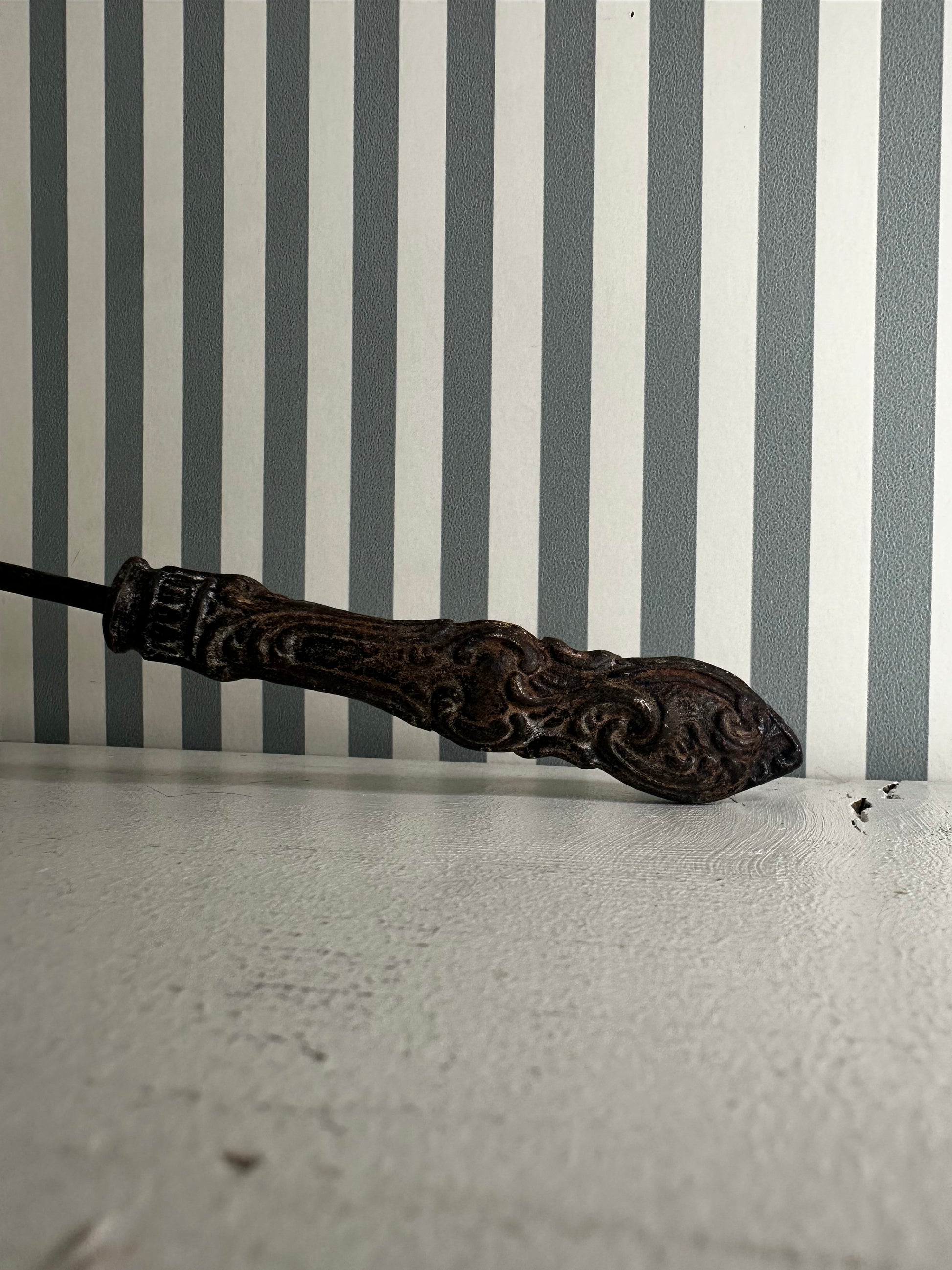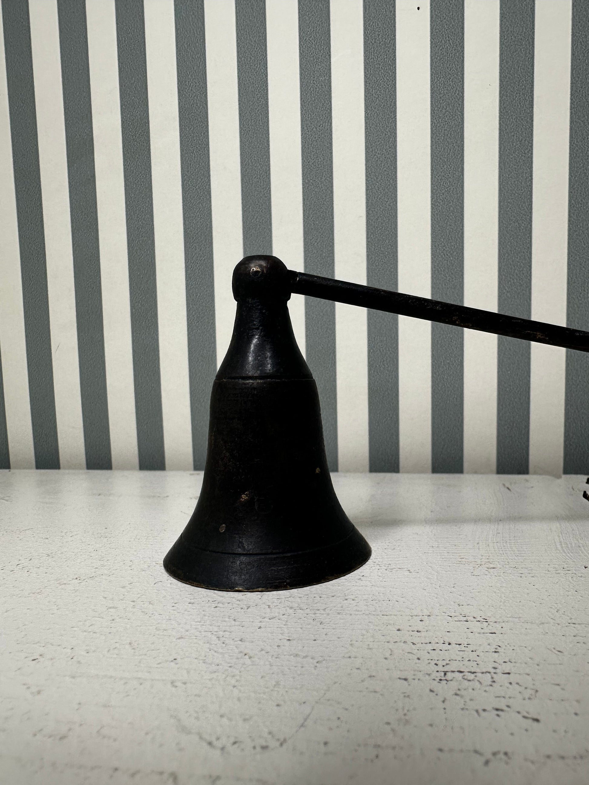 Élégant et plein de caractère, cet éteignoir ancien mêle une tige fine, une cloche noire patinée et un manche richement sculpté, au charme presque baroque. Un bel objet du quotidien d’autrefois, pensé pour éteindre la flamme sans fumée… et aujourd’hui parfait pour sublimer un coin cheminée ou une mise en scène de bougies.