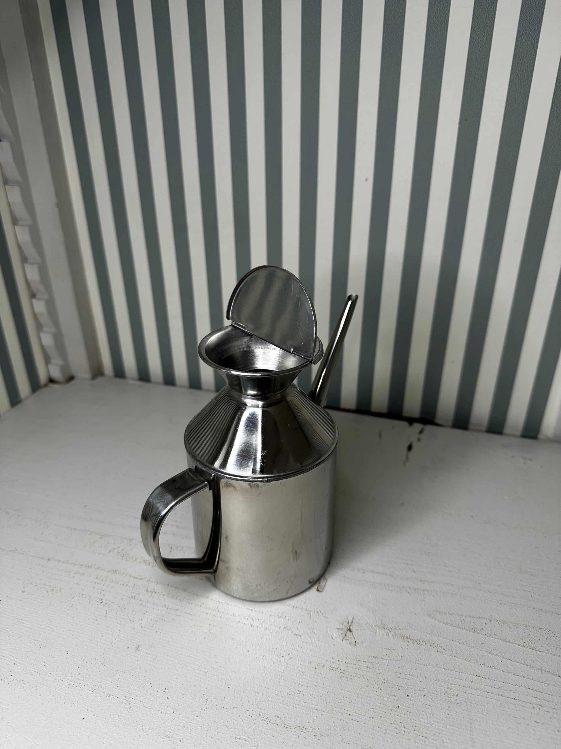 Huilier ancien en inox, au design sobre et fonctionnel, typique des années 60-70. Son bec verseur fin permet un dosage précis, tandis que sa silhouette épurée en fait un bel objet utilitaire… ou décoratif sur un plan de travail ou une table.