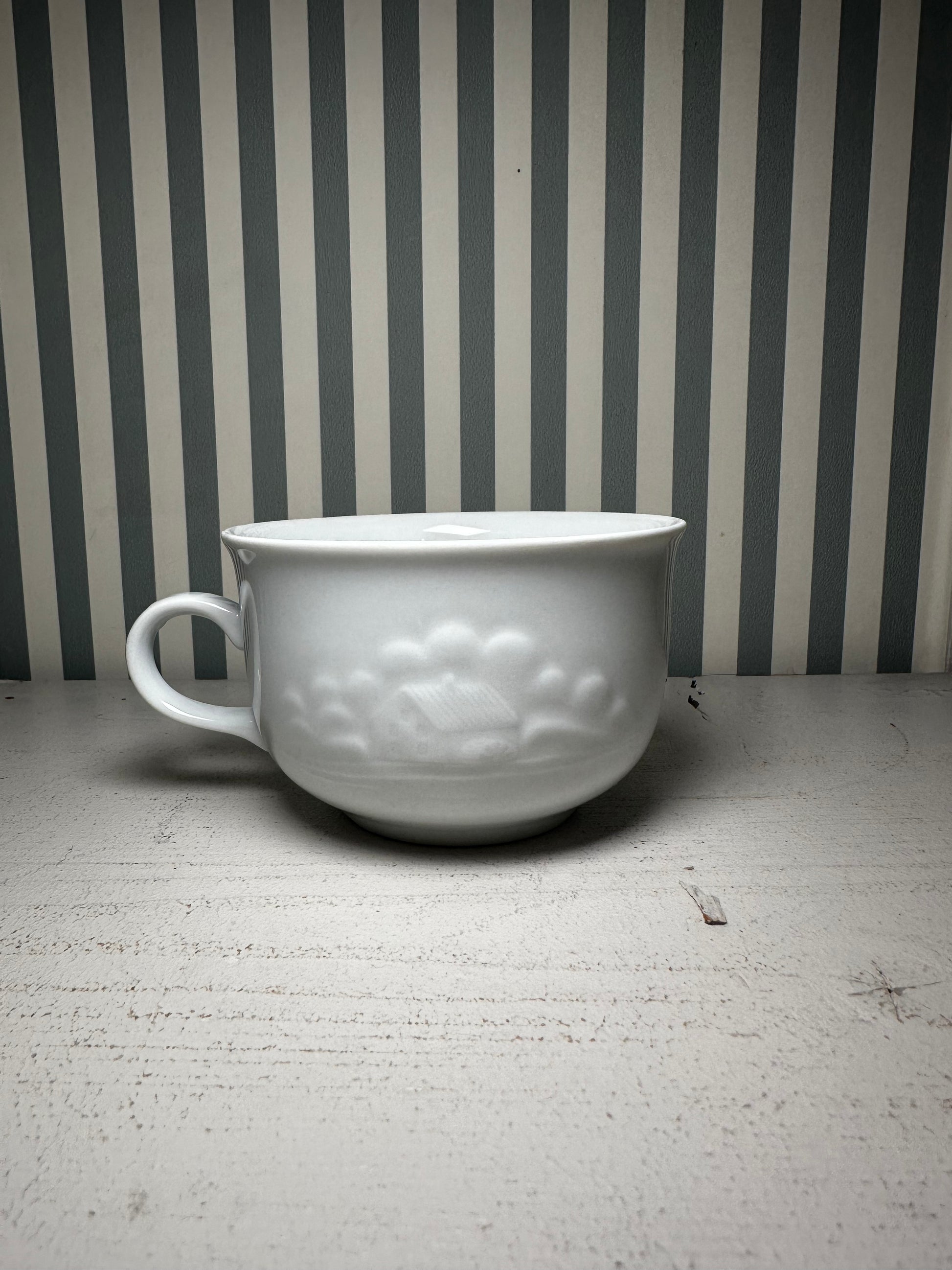 Grand mug en céramique blanche, décor en relief ton sur ton représentant une petite maison entourée d’arbres. Un modèle tout en douceur, entre charme champêtre et esprit maison de famille.