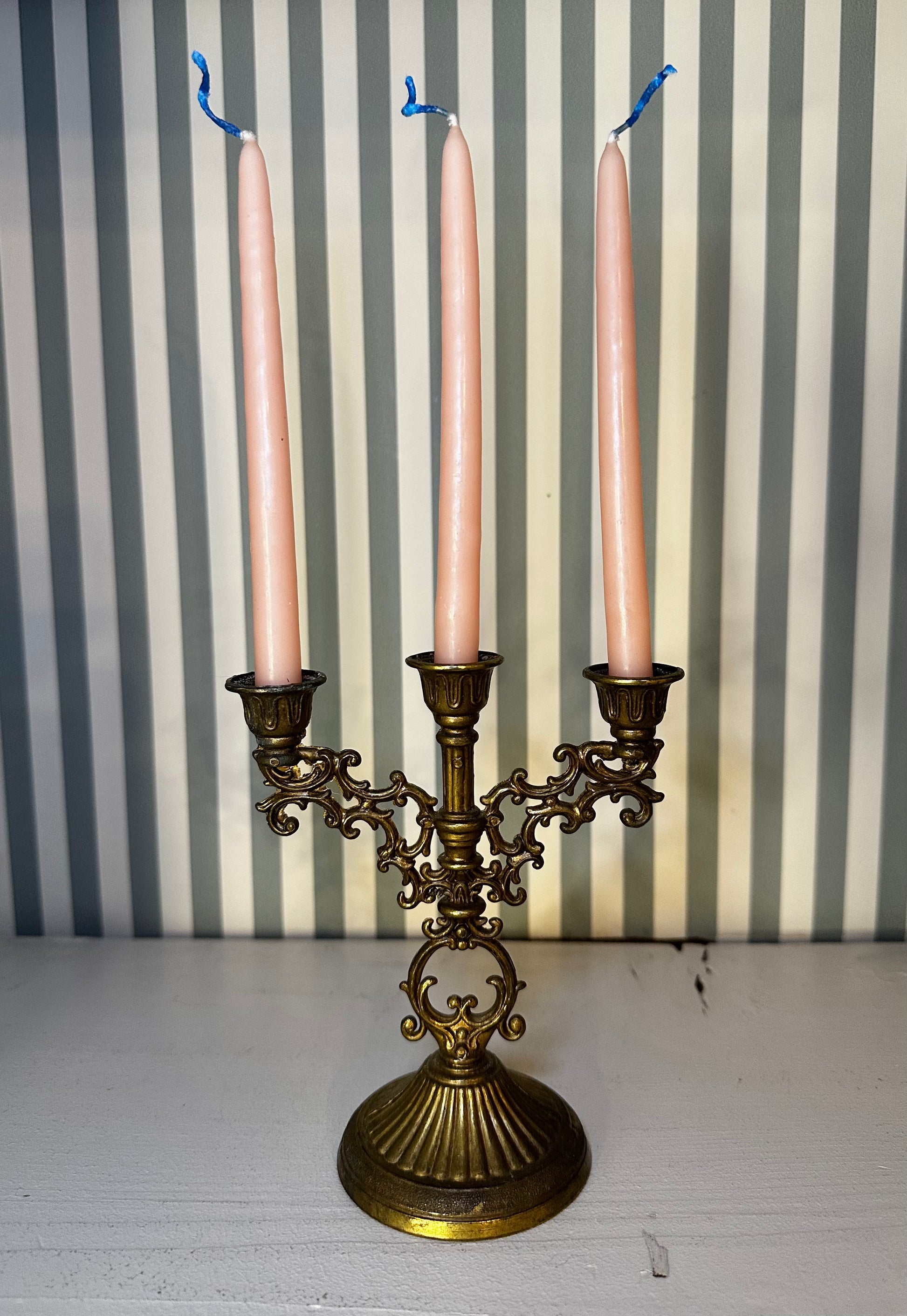 Charmant chandelier à trois branches en métal doré, au décor travaillé et plein de caractère. Une pièce vintage qui apporte instantanément une ambiance chaleureuse et un petit air théâtral à n’importe quel coin de la maison.