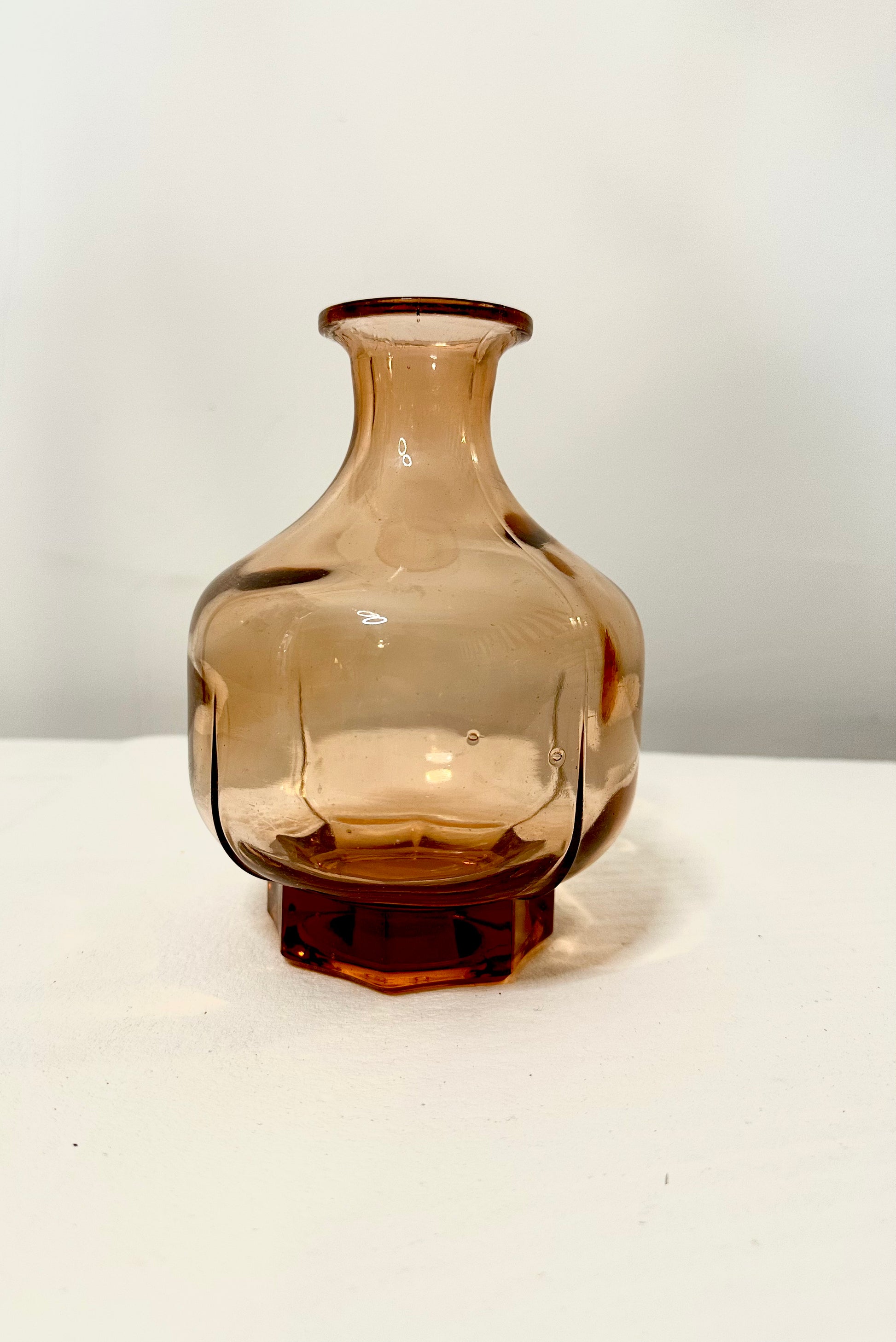 Un adorable vase en verre ambré, avec sa silhouette arrondie et son petit socle facetté. Parfait pour accueillir une ou deux fleurs séchées ou simplement pour décorer une étagère.
