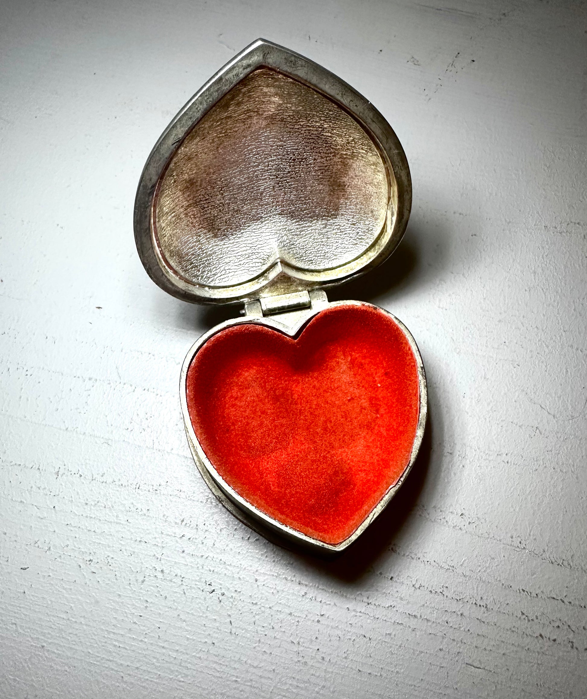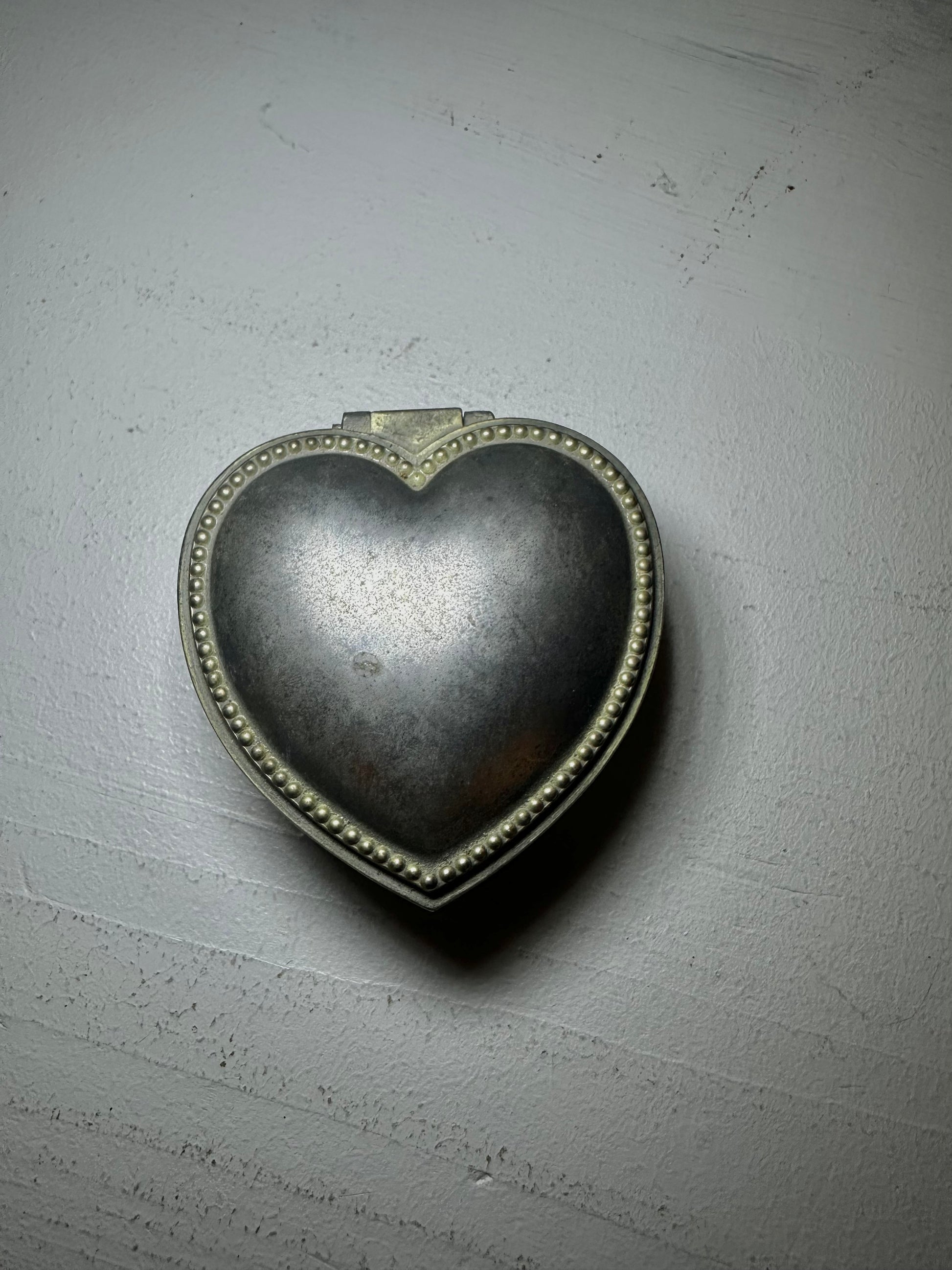 Petite boîte en métal en forme de cœur, bordée de perles, avec un intérieur en velours rouge. Parfaite pour glisser un bijou, un souvenir ou un mot doux.