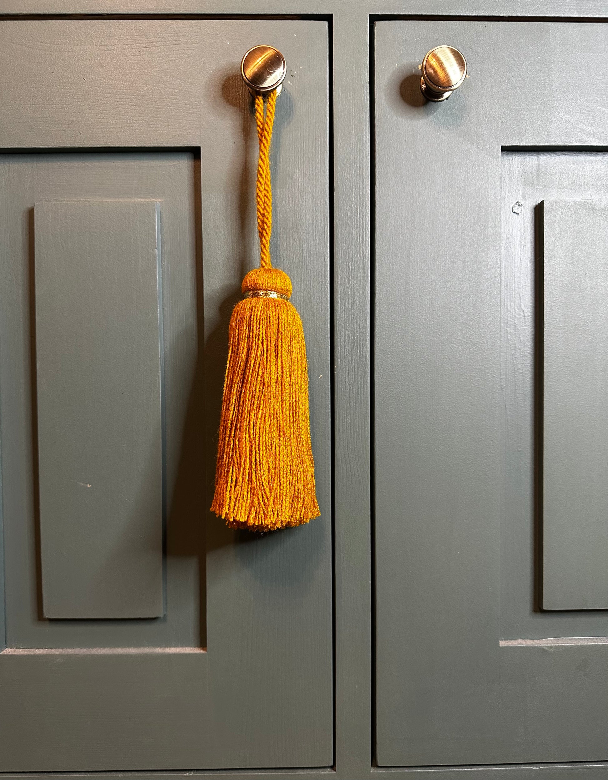 Pompon coloré fait main en laine,avec lien en lurex doré pour une touche lumineuse et festive.