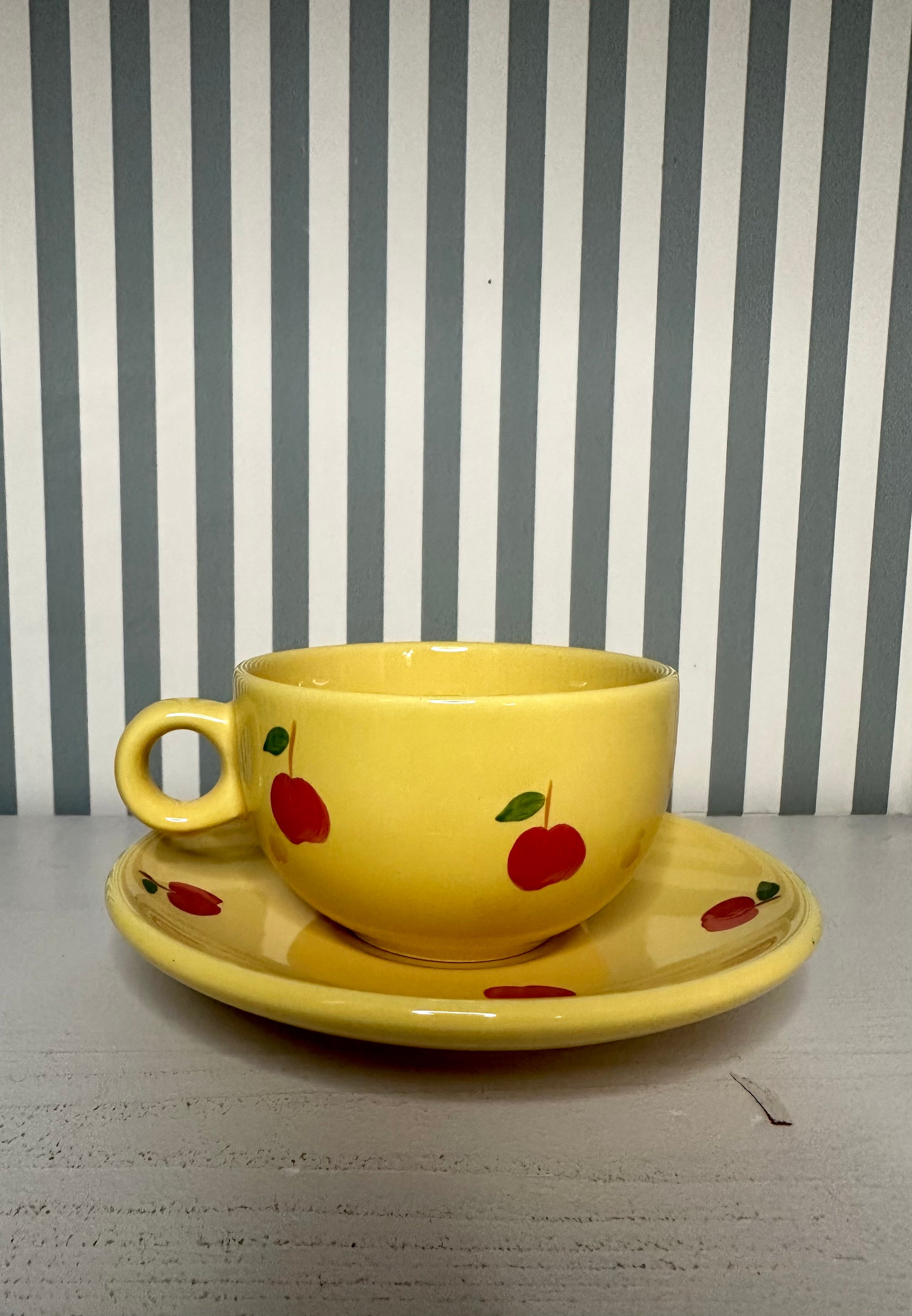 Ensemble tasse + soucoupe tout jaune et tout joyeux, décoré de petites pommes rouges peintes. Un duo plein de pep’s, parfait pour le petit-déjeuner ou pour égayer la cuisine.