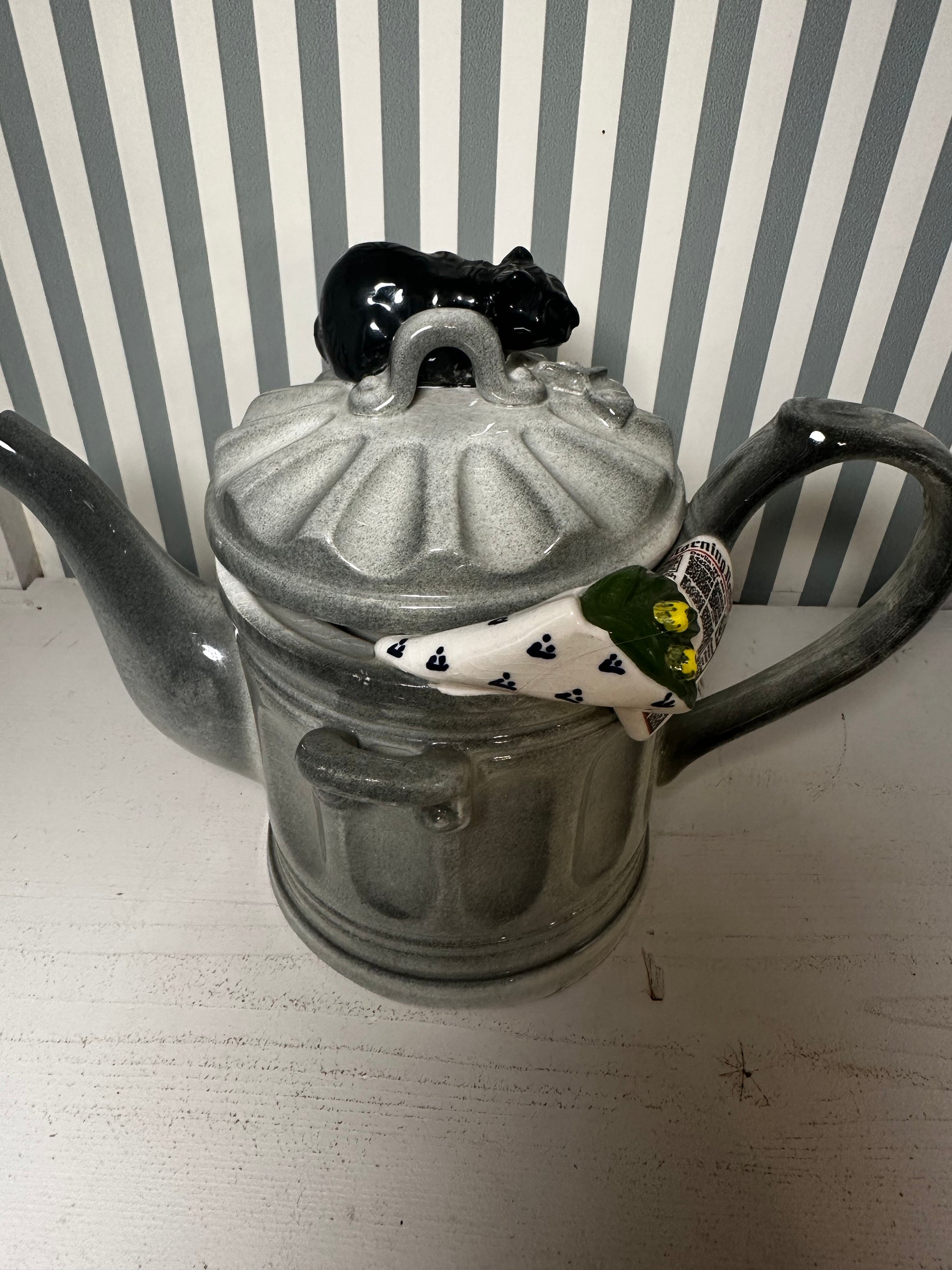 Théière en céramique émaillée gris moucheté, sculptée en forme de petite poubelle ancienne, avec couvercle orné d’un petit chat noir.