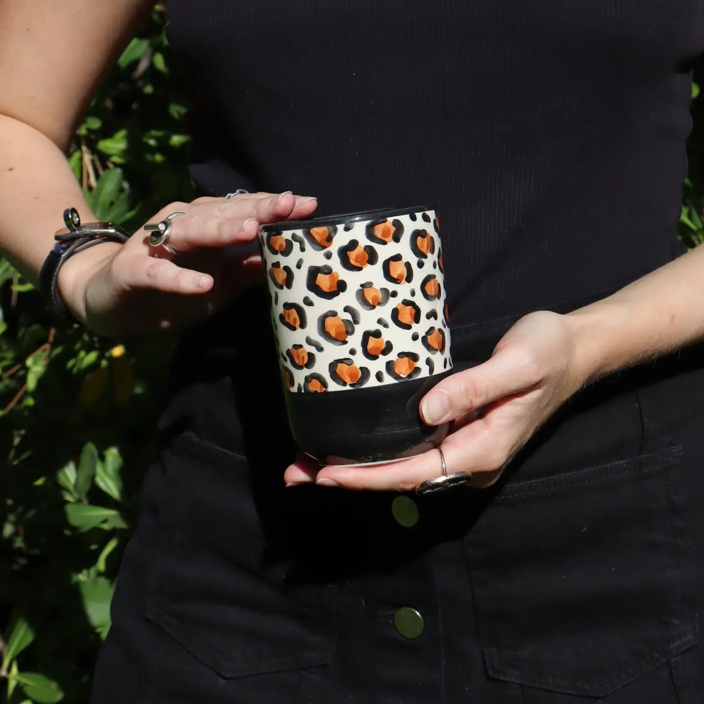 Gobelet en céramique fait main, mi-tasse mi-verre, à l’extérieur noir profond et à l’intérieur léopard.